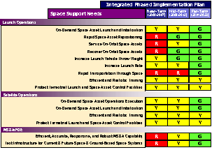 Chapter 7 provides a comprehensive assessment of the Integrated Phased Implementation Plan relative to the AFSPC Vision; the mission area Needs for achieving the AFSPC Vision; the Integrated Priority Lists from the Commanders-in-Chief of USSPACECOM, NORAD and USSTRATCOM; and the USSPACECOM Long Range Plan Operational Concepts.
